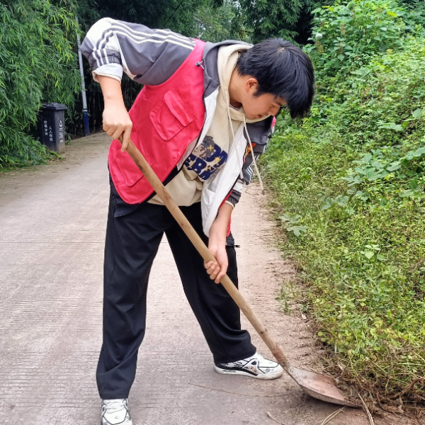 活动伊始,志愿者们手持扫帚、铁锹、垃圾袋等清洁工具,精神饱满地投入到环境整治工作中。他们分工协作,默契配合:有的奋力挥动扫帚,将道路两旁堆积的落叶和杂物归拢成堆;有的细心用铁锹清理碎石和淤泥;更多的同学则深入绿化带和田间地头,俯身捡拾隐匿在草丛、角落里的塑料瓶、包装袋等白色垃圾。大家干劲十足,不怕脏、不怕累,汗水浸湿了衣襟,尘土沾上了衣衫,但劳动的热情丝毫不减。在欢声笑语中,一堆堆垃圾被清运装袋,一段段路面恢复整洁,志愿者们忙碌的身影与乡村景致交融,构成了一道亮丽的青春风景线。