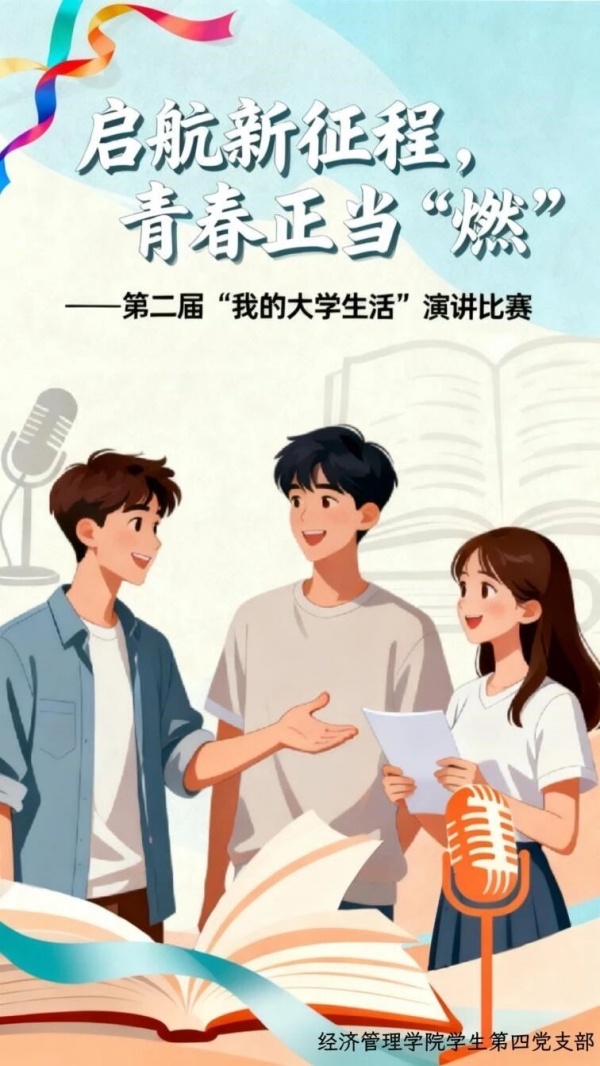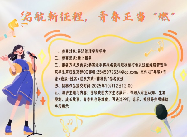 诚邀经济管理学院全体同学踊跃报名参与学风建设月活动“我的大学生活”主题演讲比赛,让我们以演讲为舟,载着青春理想启航;以声音为笔,书写大学岁月的精彩篇章。期待你在舞台上绽放光芒,共同绘就经管学子的青春答卷!你们的每一份精彩表现都将为本次活动注入崭新力量,让我们携手并进,共同聆听未来的期许吧!