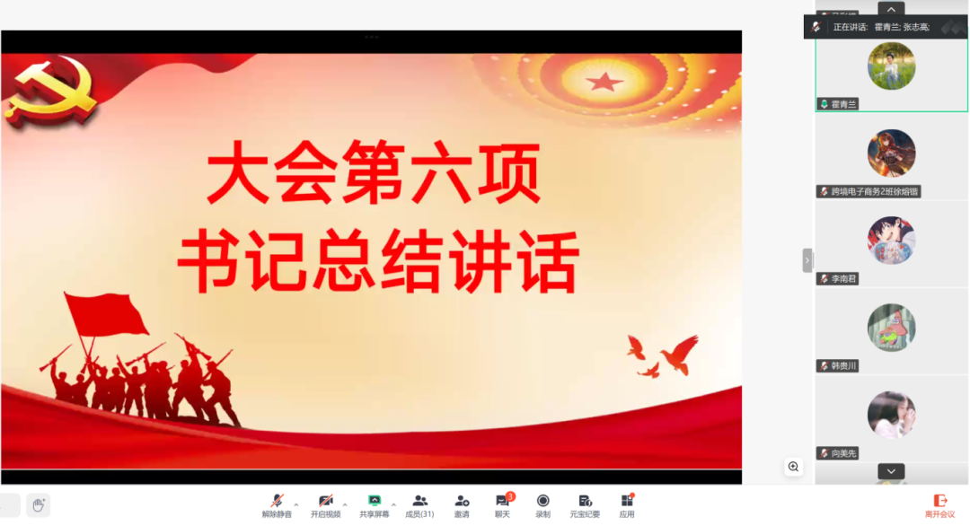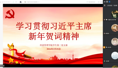 为深入学习贯彻习近平总书记2026年新年贺词和新春慰问重要讲话精神,引导支部党员凝聚奋进力量,以昂扬姿态迎接“十五五”开局之年,2月25日,经济管理学院学生第二党支部于线上(腾讯会议)开展以“万马奔腾开新局,初心如磐话新年”为主题的党日活动。支部书记霍青兰及全体党员同志参加,会议由张志高同志主持。