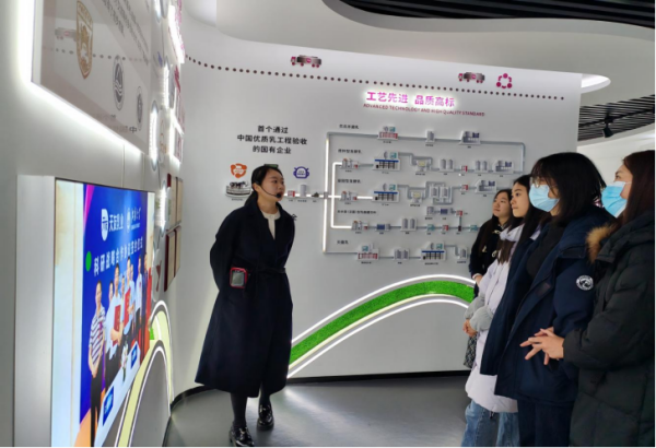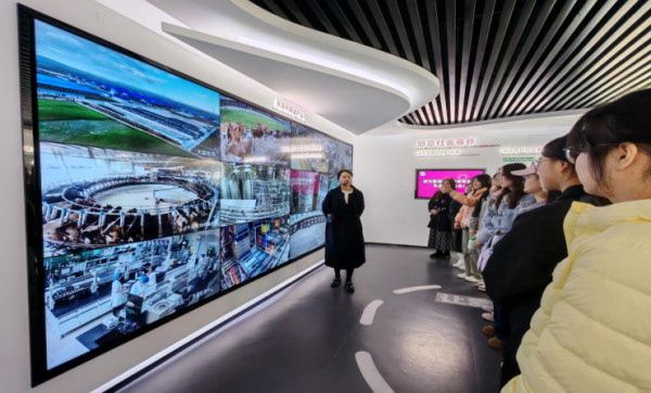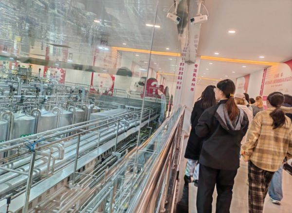 在讲解员的引导下,同学们首先来到全封闭智能化生产线:原奶经派克速冷技术20秒内由36℃降至4℃,一罐罐“百特・特鲜活”鲜牛奶有序下线;公辅能源车间的AI云智控系统无需人工值守,即可把空压站能耗降低32%。供应链指挥中心8K巨屏实时滚动“牧场—工厂—终端”全链路数据,订单、库存、物流、资金“四流合一”,让“产供销存财”一目了然。