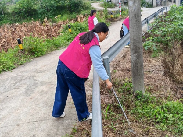 活动伊始,45名志愿者在指导老师的组织下兵分三路。虽为不同小队却肩负同样使命,都手持夹子、垃圾袋与工具,在区域内同步开展整治:或是躬身专注乡道洁净,拾捡道旁散落的废纸与塑袋;或是持帚负责路面深度清扫,俯身拂净地面荒叶枯枝让路面净洁如新;亦或是专攻路侧绿植规整,精准铲除杂草植被以保路面宽敞洁净。每一组都在各自区域认真作业,以实际行动助力清洁美丽乡村的建设。