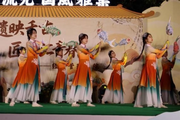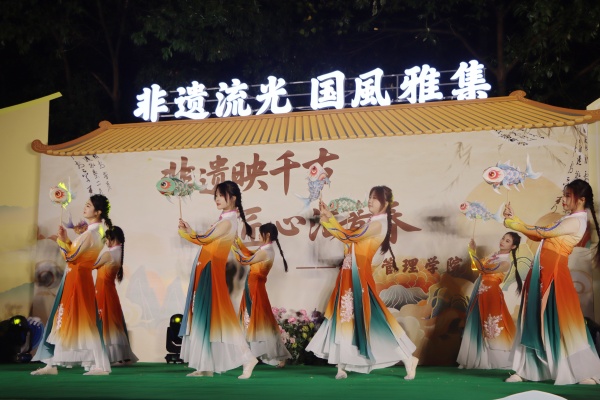 非遗舞蹈表演《灯映鲤跃》中,经济管理学院舞蹈队员手持流光溢彩的鲤鱼灯,在幽暗的舞台上轻盈穿梭、婉转游动。那静谧而灵动的光影,仿佛携着古老的祝福与期盼,瞬间将观众带入一个充满诗意的非遗世界,寓意着学子如鲤跃龙门,也悄然拉开了传统与现代对话的序幕。