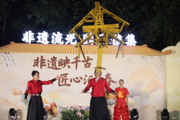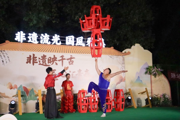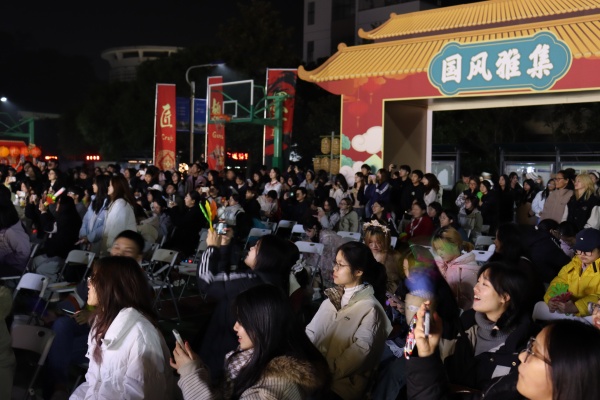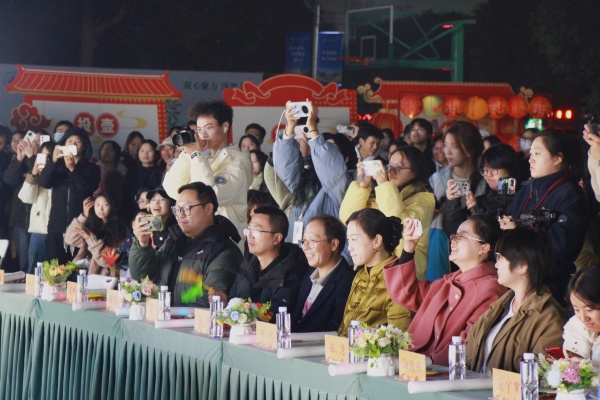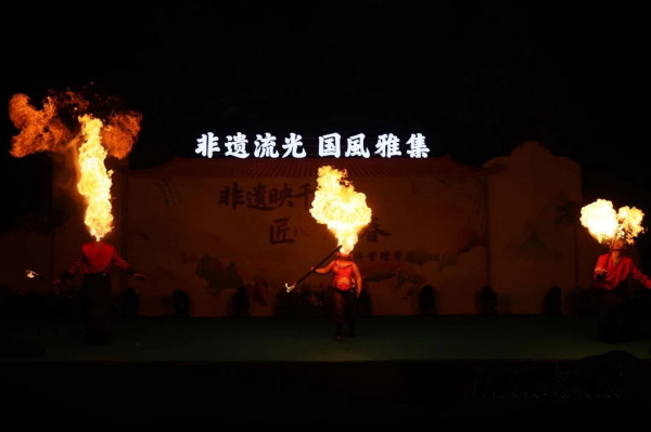 民俗技艺表演将全场气氛推向高潮:神秘莫测的川剧变脸在观众席间穿梭互动,瞬息万变的脸谱引来阵阵惊呼;刚柔并济的传统杂技以高难度的技巧展现力与美的完美平衡,赢得满堂喝彩;灵动活泼的舞狮随着欢快的锣鼓腾跃翻飞,为师生送上吉祥祝福,引发全场的欢笑与掌声;而传承人带来的古老喷火绝技,在熊熊烈焰照亮夜空的刹那,以撼人心魄的视觉冲击展现了非遗技艺的原始张力,将观众对传统文化的敬畏与热情彻底点燃。