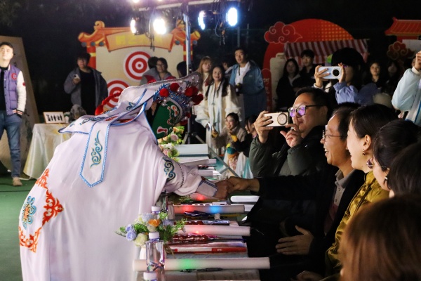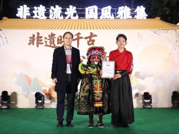 随后,晚会迎来了一个重要时刻。在重庆城市科技学院党委副书记、副校长贾瑞的主持下,学院正式聘请李文杰非遗表演团队为“校园非遗传习导师团队”。这一举措,标志着经济管理学院在构建“校-地-传承人”三方交流平台、推动非遗常态化校园传承方面迈出了坚实的一步,为这场“古今对话”建立了长效的机制保障。
