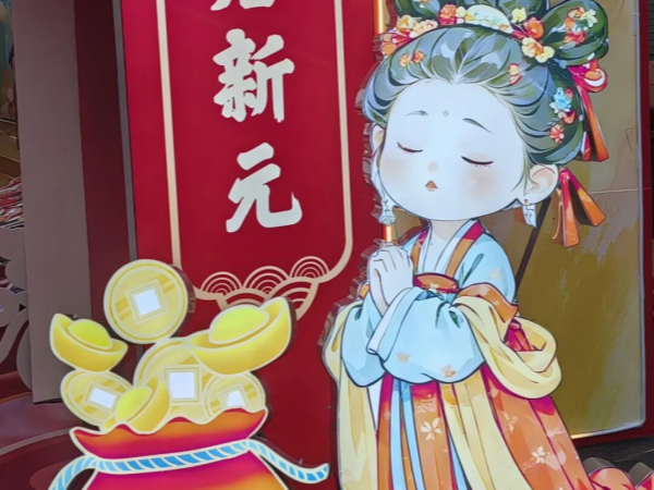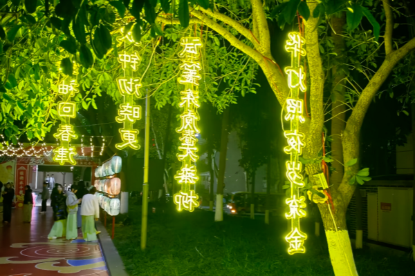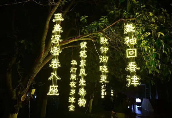 暮色初合,华灯粲然。入口长廊宫灯垂挂,暖光流转;上空灯带交织如星河,勾勒出璀璨穹顶。树木枝桠间,发光的古诗词灯牌如萤火翩跹,文韵盎然。点缀着发光的唐装女孩、骏马与聚宝盆等艺术灯组,亲切可爱,寓意吉祥。整体光影疏密有致,构筑出一片温馨繁华、如梦似幻的盛唐夜景。
