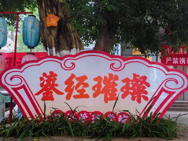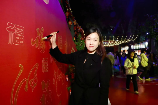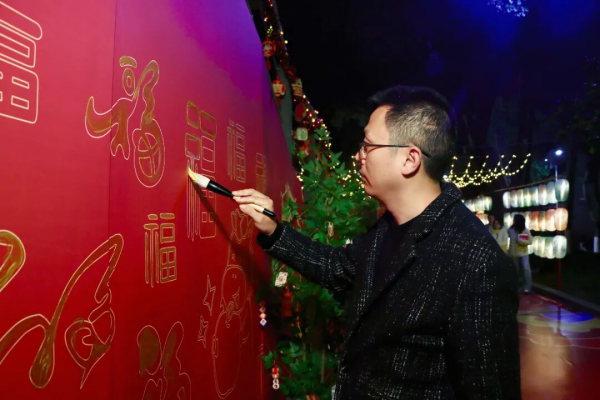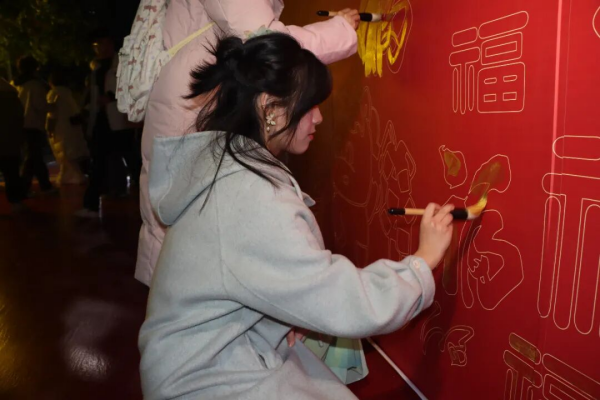 一旁的打卡区内,长案铺宣,一盏仿宫灯悬于一旁,洒下柔光如昼。金墨在灯下流转生辉,师生执笔轻蘸,俯身细描红底“福”字。笔尖游走,金泽铺展,光影在墙面跳跃,似有鎏金岁月静静沉淀,灯影墨香,相映成雅。