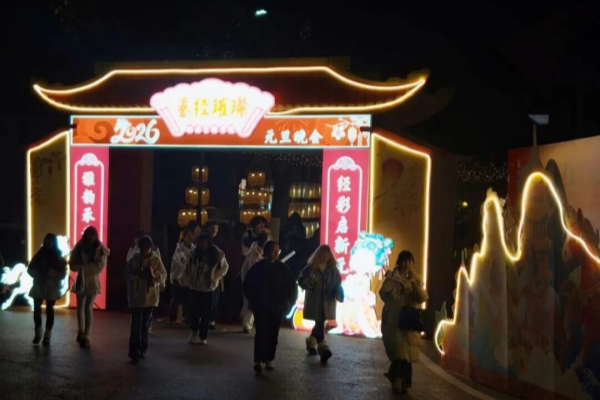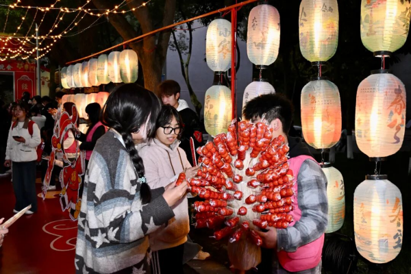 移至“九重宫阙”,现场人声鼎沸,灯火粲然。手持集章梦引帖的师生们,在攒动的人流中抽取“菜名卡”,盛唐风韵此刻化为眼前活色生香的味觉盛宴。