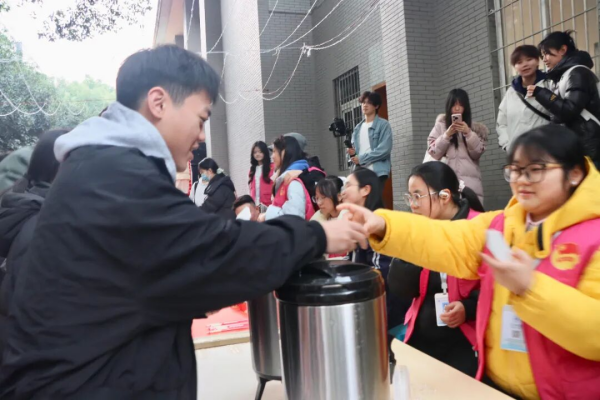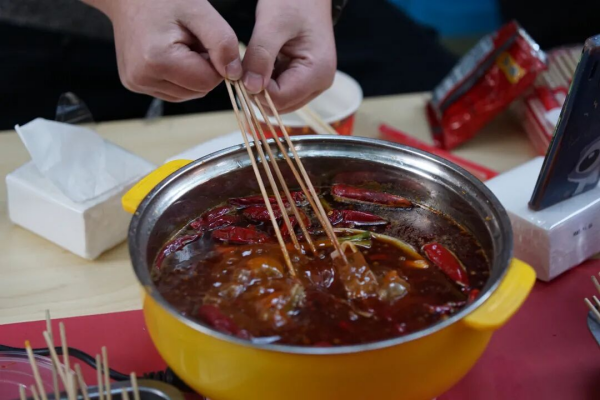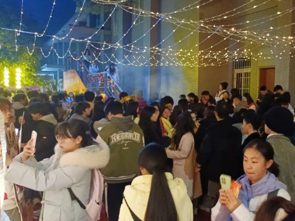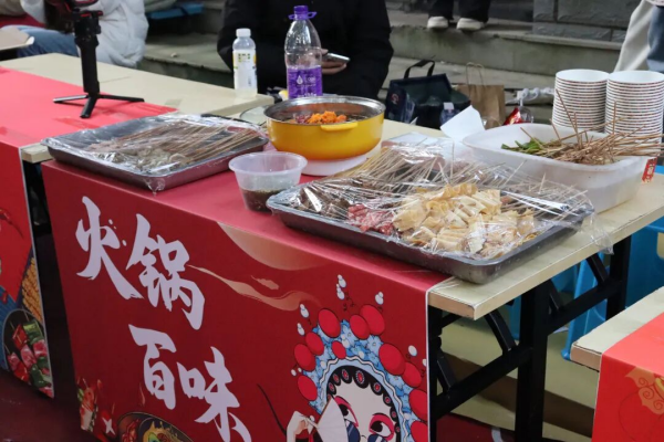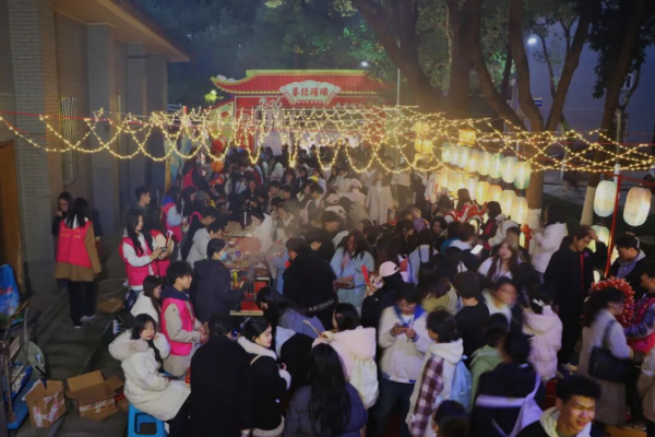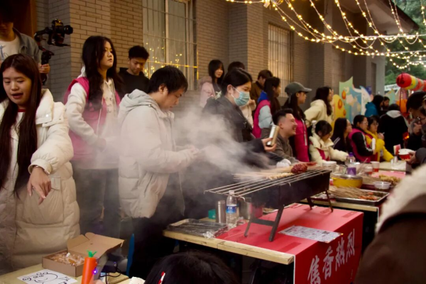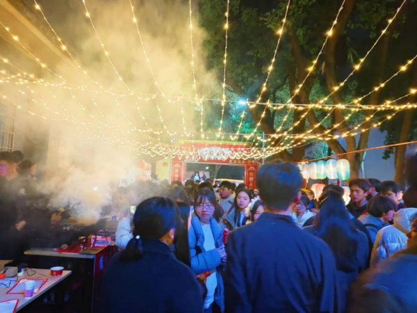 糖画摊前围满人群,执勺流糖,光影间顷刻凝成晶莹图案,甜香四溢中惊叹连连;火锅摊热气蒸腾,红汤翻滚、串串满目,师生挨坐举箸,谈笑间市井烟火气扑面而来;烧烤区炭火明红,肉串滋响、油光焦香,人群围拢处笑语喧哗不断;奶茶摊前队伍蜿蜒,茶奶香气随风轻飘,人手一杯笑意浅漾,温润了喧闹的夜;冰糖葫芦亮泽诱人,师生执串相视而笑,暖光映照张张笑脸,甜意漫入满是欢情的夜色里。
