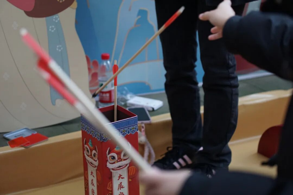 灯辉交织,人流如潮,游戏区处处悬挂各式灯笼与灯带,明暗摇曳如星河倾泻。师生摩肩接踵穿行于光影间,欢声起伏,热闹非凡。灯影猜谜处暖灯高悬,谜卡在晚风中轻摇,人群簇拥仰首、细语商讨,猜中时笑语伴着清脆落章声四起。投壶区队伍蜿蜒,目光齐聚壶口,箭矢入壶叮咚作响,暖光跃动映亮张张笑脸,得“福”者喜形于色。沙包区被人群环绕,扬手抛出间弧线牵动视线,喝彩随之涌起,“智”章频发,节奏轻快。捶丸区击球声清脆不绝,玩家躬身挥杆,身影在灯下凝成跃动剪影,四周欢呼摇曳,胜者获“喜”章,热烈之气扑面而来。