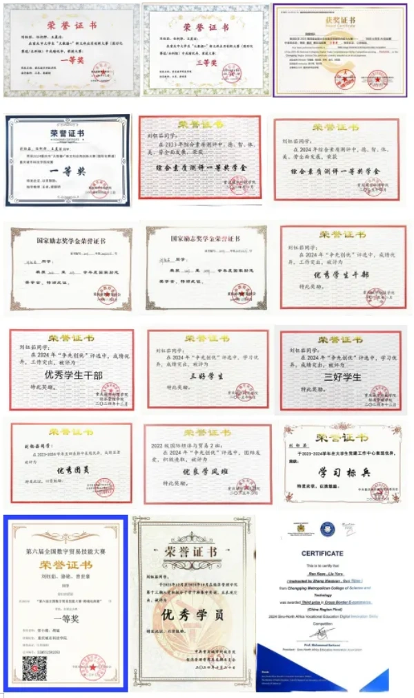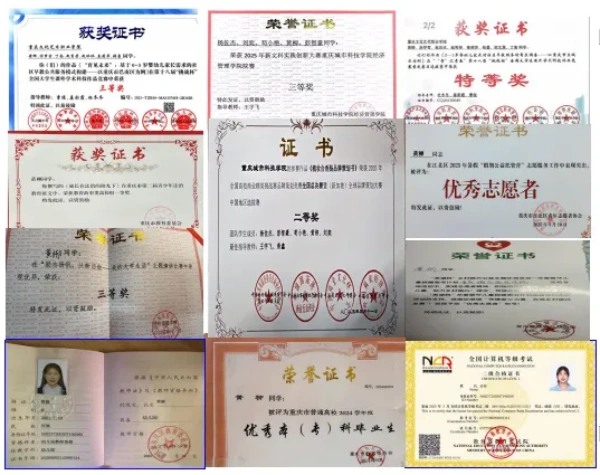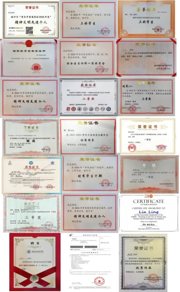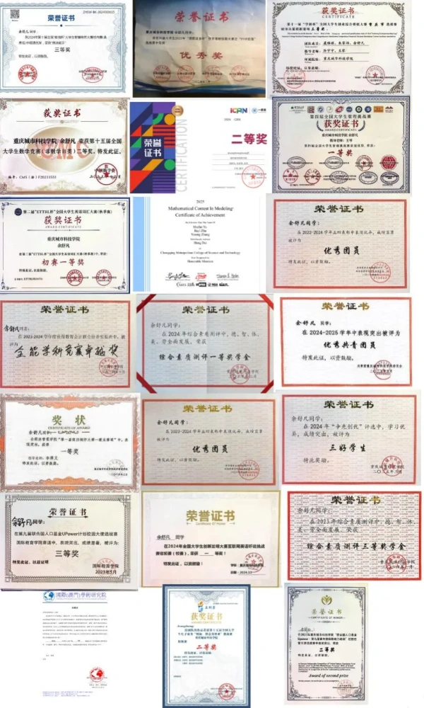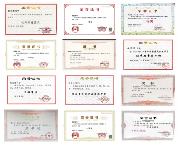 获2025国家奖学金、MCM/MIM美国大学生数学建模大赛Honorable Mention奖、ICAN全国大学生创新创业数字化经营模拟赛道二等奖、第二届“ETTBL杯”全国大学生英语词汇大赛一等奖、第四届全国大学生管理挑战赛一等奖并获得推荐信、第十五届全国大学生数学竞赛(非数学B类)二等奖、A第十一届“学创杯”全国大学生创业综合模拟大赛重庆市选拔赛财务决策模拟赛项三等奖、第十届全国“衡信杯”大学生智慧税务大赛校内赛三等奖、川渝大学生2023年“国联证券杯”投资理财技能大赛之“FOF经理”挑战赛优秀奖、第十五届三创赛校二等奖、全国大学生创新发明大赛互联网英语听说挑战赛校一等奖、经济管理学院第一届简历制作大赛一等奖、2022-2023学年综测三等奖学金、2023-2024年度优秀团员、2024年度三好学生、2023-2024学年卓越班优秀学院荣誉称号、2024学年综测一等奖学金、2024-2025优秀共青团员荣誉称号;